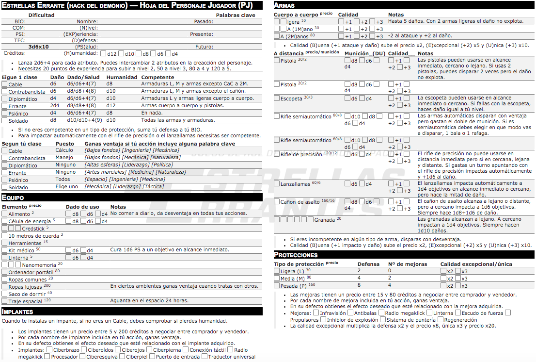 En el caso de Estrellas Errantes tenemos un A4 para cada jugador con la hoja de personaje y sus reglas por una cara, por la otra la hoja de una posible nave y sus reglas. Y para el Guardian Estelar por una cara tenemos las estadísticas de los oponentes y sus naves y por el otro lado el resto de reglas.